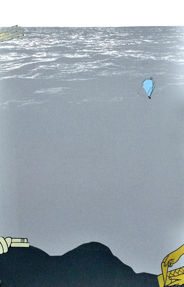 Retaining memories seems impossible for me, and this is my visual analogy for that struggle. In this piece, objects that suggest an archive (a manila folder, a filing cabinet, a briefcase) feature prominently. I imagine that the ocean, in its vastness and with its repetition, is in some ways like an archive. The water and the waves are the events but also the only place for the recordkeeping. Each specific wave inevitably transforms into the next one, created from the exact substance as the last, so the erasure is complete.