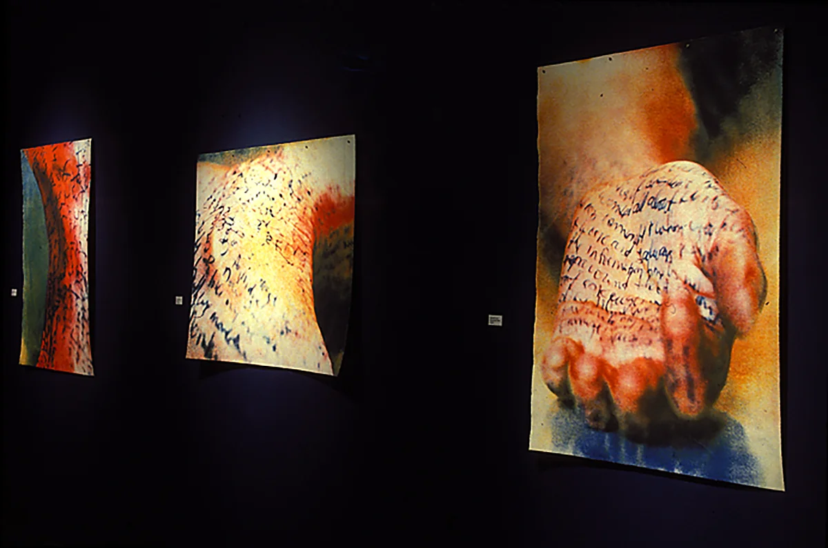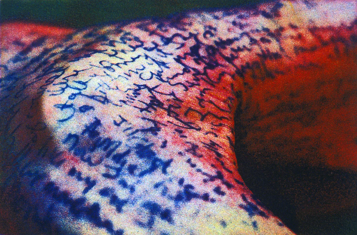 I had a potent dream which I recreated through this print series about unfinished conversations interrupted by a fatal accident, about questions that will never be answered. I transcribed journal entries all over my own body with ballpoint pen, then documented this event with photographs. I intentionally intensified the reds of the flesh during printing to provoke a visceral reaction—the flesh should be unmistakable, the violence of this loss should be palpable. The text in each print is illegible in most areas and focused in others; it is in these areas of focus that the words for the titles emerge. This project is about memory and loss, about trying to communicate across time and space.